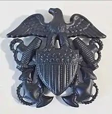 In 1905, two crossed silver sprigs, each composed of two oak leaves and an acorn (sometimes called "Crossed Bananas"), was adopted as the insignia of the Civil Engineer Corps replacing the Old English letters C.E. These were to be worn on the epaulets, shoulder straps and collar of the service coat.[2] While the pattern of this corps device remained the same, uniform regulations issued in 1919 specified that it was to be embroidered in gold instead of silver and worn on the sleeve of frock, evening dress, and blue service coats, above the gold lace strips, and on shoulder marks for white service coat and overcoat. By these same regulations the light blue cloth worn under the sleeve strips, and worn on the shoulder marks since 1899, was abolished as a distinction of the corps, however is still present in the light blue color of the stripes worn by enlisted, pay grades E-3 and below in the Navy's construction field.