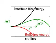 For small the second surface term dominates and . The free energy is the sum of an and terms. Now the terms varies more rapidly with than the term, so as small the term dominates and the free energy is positive while for large , the term dominates and the free energy is negative. This shown in the figure to the right. Thus at some intermediate value of , the free energy goes through a maximum, and so the probability of formation of a nucleus goes through a minimum. There is a least-probable nucleus size, i.e., the one with the highest value of