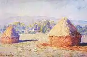 Dissatisfied with the limitations of Impressionism, Monet began to work on series of paintings displaying single subjects—haystacks, poplars and the Rouen Cathedral—to resolve his frustration.[24][64] These series of paintings provided widespread critical and financial success; in 1898, 61 paintings were exhibited at the Petit gallery.[72] He also begun a series of Mornings on the Seine, which portrayed the dawn hours of the river.[15] In 1887 and 1889 he displayed a series of paintings of Belle Île to rave reviews by critics.[66] Monet chose the location in the hope of finding a "new aesthetic language that bypassed learned formulas, one that would be both true to nature and unique to him as an individual, not like anyone else."[66]