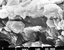 Clay is a very common substance. Shale, formed largely from clay, is the most common sedimentary rock.[9] Although many naturally occurring deposits include both silts and clay, clays are distinguished from other fine-grained soils by differences in size and mineralogy. Silts, which are fine-grained soils that do not include clay minerals, tend to have larger particle sizes than clays. Mixtures of sand, silt and less than 40% clay are called loam. Soils high in swelling clays, which are clay minerals that readily expand in volume when they absorb water, are a major challenge in civil engineering.[1]