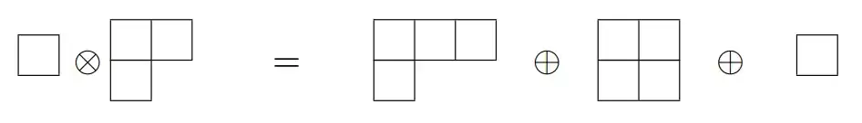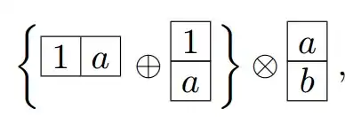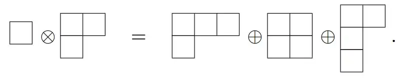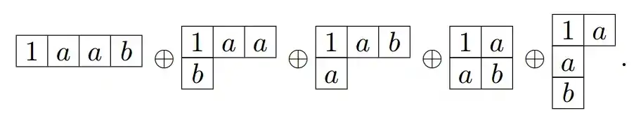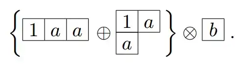 - Procedure to obtain the Clebsch–Gordan series from Young tableaux: - The following steps are followed to construct the Clebsch–Gordan series from the Young tableaux:[19] - Write down the two Young diagrams for the two irreps under consideration, such as in the following example. In the second figure insert a series of the letter a in the first row, the letter b in the second row, the letter c in the third row, etc. in order to keep track of them once they are included in the various resultant diagrams: