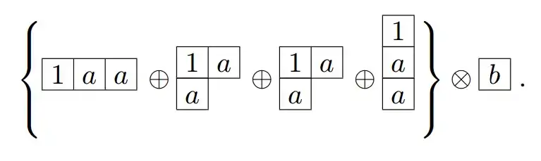 - Take the first box containing an a and appends it to the first Young diagram in all possible ways that follow the rules for creation of a Young diagram: