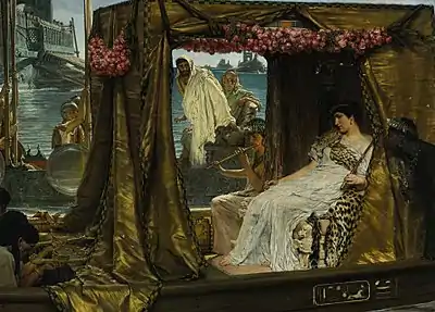 By the end of 42 BC, Octavian had gained control over much of the western half of the Roman Republic and Antony the eastern half, with Lepidus largely marginalized.[200] In the summer of 41 BC, Antony established his headquarters at Tarsos in Anatolia and summoned Cleopatra there in several letters, which she rebuffed until Antony's envoy Quintus Dellius convinced her to come.[201][202] The meeting would allow Cleopatra to clear up the misconception that she had supported Cassius during the civil war and address territorial exchanges in the Levant, but Antony also undoubtedly desired to form a personal, romantic relationship with the queen.[203][202] Cleopatra sailed up the Kydnos River to Tarsos in Thalamegos, hosting Antony and his officers for two nights of lavish banquets on board the ship.[204][205][note 45] Cleopatra managed to clear her name as a supposed supporter of Cassius, arguing she had really attempted to help Dolabella in Syria, and convinced Antony to have her exiled sister, Arsinoe IV, executed at Ephesus.[206][207] Cleopatra's former rebellious governor of Cyprus was also handed over to her for execution.[206][208]