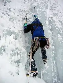 - Ice climbing: Ascending ice or hard snow formations using special equipment, usually ice axes and crampons. Techniques of protecting the climber are similar to those of rock climbing, with protective devices (such as ice screws and snow wedges) adapted to frozen conditions.