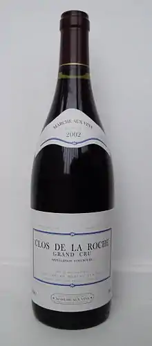 Clos de la Roche is an Appellation d'origine contrôlée for red wine in the Côte de Nuits subregion of Burgundy, with Pinot noir as the main grape variety.[1] It is situated in the commune of Morey-Saint-Denis in the Côte-d'Or département. Clos de la Roche is located in the northern part of the commune, stretches to the border of Gevrey-Chambertin, and borders to the Grand Cru vineyard Clos Saint-Denis in the south. It borders the Route des Grands Crus in the east. The AOC was created in 1936, and the Clos part of its name refers to a wall-enclosed vineyard.