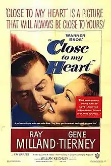Close to My Heart is a 1951 American drama film directed by William Keighley, written by James R. Webb (based on his novel A Baby for Midge), and starring Ray Milland and Gene Tierney.[1][2]
