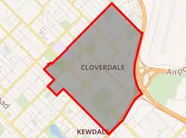 Cloverdale is approximately diamond-shaped, and represents the eastern quarter of Belmont's main residential area. It is bounded by Belmont Avenue to the southwest, Sydenham Street to the northwest, Epsom Avenue to the northeast, Tonkin Highway (Route 4) to the east and Leach Highway (Route 7) to the southeast. Abernethy Road (Route 55) runs northwest to southeast through the suburb.[3]