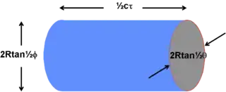 First find the magnitude of the clutter return. Assume that the clutter fills the cell containing the target, that scatterers are statistically independent and that the scatterers are uniformly distributed through the volume. The clutter volume illuminated by a pulse can be calculated from the beam widths and the pulse duration, Figure 1. If c is the speed of light and is the time duration of the transmitted pulse then the pulse returning from a target is equivalent to a physical extent of c, as is the return from any individual element of the clutter. The azimuth and elevation beamwidths, at a range , are and respectively if the illuminated cell is assumed to have an elliptical cross section.