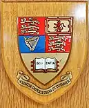 | Blazon | Per fesse in chief the Royal Arms of the United Kingdom of Great Britain and Ireland, in base or, an open book proper inscribed with the word "Scientia" |