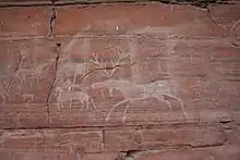 The coat of arms of the Sakha Republic (Yakut: Саха Өрөспүүбүлүкэтин дьаралыга, Saqa Öröspüübülüketin caralıga; Russian: Герб Республики Саха, Gerb Respubliki Sakha), in the Russian Federation, is an official symbol of the Sakha Republic, alongside the flag and the national anthem of the Sakha Republic. The coat of arms consists of a circle, in the center of which is a red silhouette of a rider, holding a banner, mounted upon a six-legged horse, based on the prehistoric petroglyphs of the "Shishkin pisanitsa", against a white sun background. The central image is framed with a traditional Sakha ornament in the form of seven rhombic crystal-like figures and the inscriptions "Республика Саха (Якутия) • Саха Өрөспүүбүлүкэтэ".[1] This coat of arms has been used officially since 26 December 1992.[2]