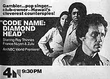 Code Name: Diamond Head is a 1977 American spy film starring Roy Thinnes as an undercover counterintelligence officer known as Diamond Head whose mission is to stop a rogue double agent from stealing the formula for a new chemical weapon. Originally filmed as a pilot for a new television drama (which was never picked up by the networks), it was eventually used for The NBC Monday Movie on U.S. broadcast network NBC.