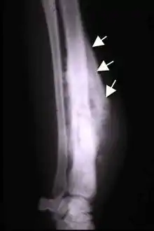 Codman triangle (previously referred to as Codman's triangle) is the triangular area of new subperiosteal bone that is created when a lesion, often a tumour, raises the periosteum away from the bone.[1] A Codman triangle is not actually a full triangle. Instead, it is often a pseudotriangle on radiographic findings, with ossification on the original bone and one additional side of the triangle, which forms a two sided triangle with one open side. This two sided appearance is generated due to a tumor (or growth) that is growing at a rate which is faster than the periosteum can grow or expand, so instead of dimpling, the periosteum tears away and provides ossification on the second edge of the triangle.[2] The advancing tumour displaces the perisosteum away from the bone medulla. The displaced and now lateral periosteum attempts to regenerate underlying bone. This describes a periosteal reaction.