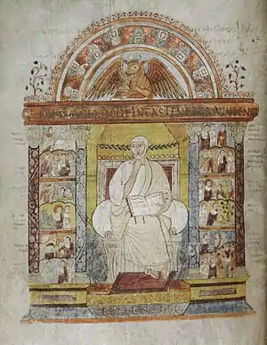 His fame rests mainly upon a long poem, Carmen paschale, based on the four gospels. In style a bombastic imitator of Virgil, he shows, nevertheless, a certain freedom in the handling of the Biblical story, and the poem soon became a quarry for the minor poets.[4] His description of the Four Evangelists in Carmen Paschale became well-known; the English translation below is from Springer (2013, p. 21).