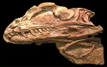 During the Early Jurassic period, the land that is now the Kayenta Formation experienced rainy summers and dry winters. By the Middle Jurassic period it was being encroached upon from the north by a sandy dune field that would become the Navajo Sandstone.[21] The animals here were adapted to a seasonal climate and abundant water could be found in streams, ponds and lakes. ‘‘C.’’? kayentakatae shared its paleoenvironment with other dinosaurs, such as several theropods including Dilophosaurus, Kayentavenator,[22] the "Shake-N-Bake" theropod, the basal sauropodomorph Sarahsaurus,[15] heterodontosaurids, and the armored dinosaurs Scelidosaurus and Scutellosaurus. The Kayenta Formation has produced the remains of three coelophysoid taxa of different body size, representing the most diverse ceratosaur fauna yet known.[16] The formation has also yielded a small but growing assemblage of organisms.[23] Vertebrates present in the Kayenta Formation at the time of ‘‘C.’’? kayentakatae included hybodont sharks, indeterminate bony fish, lungfish, salamanders, the frog Prosalirus, the caecilian Eocaecilia, the turtle Kayentachelys, a sphenodontian reptile, various lizards, and the pterosaur Rhamphinion. Also present were the synapsids Dinnebitodon, Kayentatherium, Oligokyphus, morganucodontans,[24] the possible early true mammal Dinnetherium, and a haramiyid mammal. Several early crocodylomorphs were also present, including Calsoyasuchus, Eopneumatosuchus, Kayentasuchus, and Protosuchus.[23][24][25][26] Vertebrate trace fossils from this area include coprolites[27] and the tracks of therapsids, lizard-like animals, and dinosaurs.[28] Non-vertebrates in this ecosystem included microbial or "algal" limestone,[27] freshwater bivalves, freshwater mussels and snails,[21] and ostracods.[29] The plant life known from this area included trees that became preserved as petrified wood.[25]