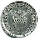 Copper-Nickel | Plain | Figure of a man seated beside an anvil holding a hammer and Mt. Mayon | Eagle atop stars-and-stripes shield; legend "United States of America"; mint date & mintmark | yyyy | 1903 1904 1905 1906 1908 1916 S 1917 S 1918 S 1919 S 1920 1921 1925 M 1926 M 1927 M 1928 M 1929 M 1930 M 1931 M 1932 M 1933 M 1934 M 1935 M | |