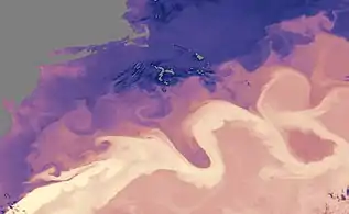 Semi-permanent and permanent eddies are also relatively abundant throughout the world. These permanent and semi-permanent rings often form systematically in the same manner and often with the same drift and properties.[5] Some permanent eddies are regular enough to be given names within the ocean current system such as the cold-core Agulhas Ring off the tip of South Africa. Western boundary currents like the Agulhas, Brazil, and East Australian Currents are known for shedding eddies downward off from their ending points.[6] A semi-permanent cold-core eddy is periodically formed by the Loop Current in the eastern Gulf of Mexico, where warm water from the South Equatorial Current travels upwards through the south Caribbean ocean and flows into the Loop Current off the coast of Cancun.[7]