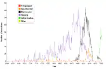 In 1982, Texas carried out the first execution by lethal injection in world history and lethal injection subsequently became the preferred method throughout the country, displacing the electric chair.[77] From 1976 to 8 December 2016, there were 1,533 executions, of which 1,349 were by lethal injection, 163 by electrocution, 11 by gas inhalation, 3 by hanging, and 3 by firing squad.[78] The South had the great majority of these executions, with 1,249; there were 190 in the Midwest, 86 in the West, and only 4 in the Northeast. No state in the Northeast has conducted an execution since Connecticut, now abolitionist, in 2005. The state of Texas alone conducted 571 executions, over 1/3 of the total; the states of Texas, Virginia (now abolitionist), and Oklahoma combined make up over half the total, with 802 executions between them.[79] 17 executions have been conducted by the federal government.[80] Executions increased in frequency until 1999; 98 prisoners were executed that year. Since 1999, the number of executions has greatly decreased, and the 17 executions in 2020 were the fewest since 1991.[13] A 2016 poll conducted by Pew Research, found that support nationwide for the death penalty in the U.S. had fallen below 50% for the first time since the beginning of the post-Gregg era.[81]