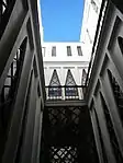 Almost all the windows are enclosed by the parabolic arches, and on the ground floor the arches form a gallery. On the first and second floors, the arches are inscribed in a rectangle of bricks. On the top floor, a succession of arches (alternating open and blind) form a large frieze that crowns the whole, which is superimposed on the roof railing which is combined with a kind of merlet. It is triangular in shape and pinnacles with four-armed crosses at the corners.[1]