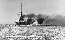 Once Jellicoe's ships had rendezvoused with the 2nd BS, coming from Cromarty, Scotland, on the morning of 31 May, he organised the main body of the Grand Fleet in parallel columns of divisions of four dreadnoughts each. The two divisions of the 2nd BS were on his left (east), the 4th BS was in the centre and the 1st BS on the right. When Jellicoe ordered the Grand Fleet to deploy to the left and form line astern in anticipation of encountering the High Seas Fleet, this naturally placed the 4th and 1st Battle Squadrons in the center and rear of the line of battle, respectively, which meant that the sisters were at the rear of the Grand Fleet once it finished deploying.[27] Both ships fired at the crippled light cruiser SMS Wiesbaden with unknown results. They also engaged and hit the battlecruisers SMS Seydlitz and SMS Derfflinger multiple times, although only inflicting light damage. In return, Seydlitz hit Colossus twice, with only minor effect, but she was the only battleship in the main body of the Grand Fleet to be hit by gunfire during the battle. They also fired at German destroyers, but failed to make any hits. Neither of the sisters fired more than 98 rounds from their main guns during the battle.[28]