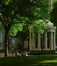"The Steps", alternatively known as "Low Steps" or the "Urban Beach", are a popular meeting area for Columbia students. The term refers to the long series of granite steps leading from the lower part of campus (South Field) to its upper terrace. With a design inspired by the City Beautiful movement, the steps of Low Library provides Columbia University and Barnard College students, faculty, and staff with a comfortable outdoor platform and space for informal gatherings, events, and ceremonies. McKim's classical facade epitomizes late 19th-century new-classical designs, with its columns and portico marking the entrance to an important structure.[99]