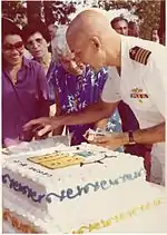 On September 12, 1982, the Chapel sponsored a "Jewish Pride in the Navy Day," that included the dedication of an 11 by 7 foot cloth-on-cloth wall hanging for the chapel, designed by local Norfolk artist Leonette Adler, and cut and sewn by Jewish officers, sailors, and their spouses.[11] The celebration included music on the Frazier Hall lawn by members of the Navy band, and tours of local Navy ships. As described by the Navy News, "the hanging features a backdrop of silver moon and roaring waves of blue and white and words from the prophet Isaiah."[11]