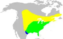 | Approximate range in North America   Breeding range   Year-round range   Wintering range | |