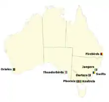 The founding members of the Commonwealth Bank Trophy league included Adelaide Ravens, Adelaide Thunderbirds, Melbourne Kestrels, Melbourne Phoenix, Perth Orioles, Sydney Sandpipers, Sydney Swifts and Queensland Firebirds. The majority of the teams were named after native Australian birds including ravens, kestrels, orioles and sandpipers. Adelaide Thunderbirds were initially going to be named Adelaide Falcons but the name was changed at the request of the rugby union team.[1] In 2003 Ravens were replaced by AIS Canberra Darters[2][3] and in 2004 Sandpipers were replaced by Hunter Jaegers.[4][5][6][7]