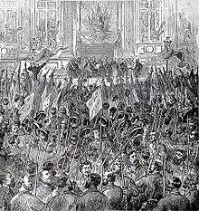 A few candidates, including Blanqui (who had been arrested when outside Paris, and was in prison in Brittany), won in several arrondissements. Other candidates who were elected, including about twenty moderate republicans and five radicals, refused to take their seats. In the end, the council had just 60 members. Nine of the winners were Blanquists (some of whom were also from the International); twenty-five, including Delescluze and Pyat, classified themselves as "Independent Revolutionaries"; about fifteen were from the International; the rest were from a variety of radical groups. One of the best-known candidates, Georges Clemenceau, received only 752 votes. The professions represented in the council were 33 workers; five small businessmen; 19 clerks, accountants and other office staff; twelve journalists; and a selection of workers in the liberal arts. 20 members are Freemasons.[45] All were men; women were not allowed to vote.[46] The winners were announced on 27 March, and a large ceremony and parade by the National Guard was held the next day in front of the Hôtel de Ville, decorated with red flags.