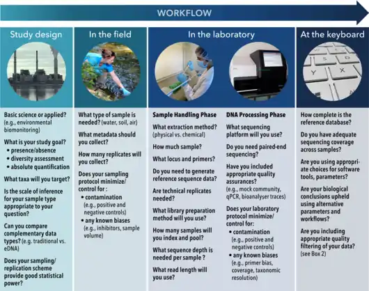 Despite the obvious power of the approach, eDNA metabarcoding is affected by precision and accuracy challenges distributed throughout the workflow in the field, in the laboratory and at the keyboard.[46] As set out in the diagram at the right, following the initial study design (hypothesis/question, targeted taxonomic group etc) the current eDNA workflow consists of three components: field, laboratory and bioinformatics.[13] The field component consists of sample collection (e.g., water, sediment, air) that is preserved or frozen prior to DNA extraction. The laboratory component has four basic steps: (i) DNA is concentrated (if not performed in the field) and purified, (ii) PCR is used to amplify a target gene or region, (iii) unique nucleotide sequences called “indexes” (also referred to as “barcodes”) are incorporated using PCR or are ligated (bound) onto different PCR products, creating a “library” whereby multiple samples can be pooled together, and (iv) pooled libraries are then sequenced on a high‐throughput machine. The final step after laboratory processing of samples is to computationally process the output files from the sequencer using a robust bioinformatics pipeline.[13]