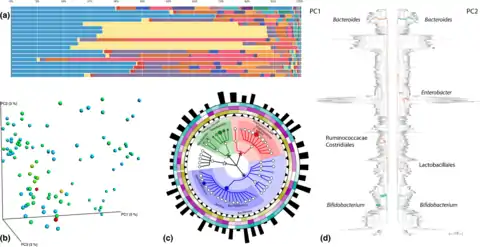 d) Edge PCA, a tree‐based diversity metric that identifies specific lineages (green/orange branches) that contribute most to community changes observed in samples distributed across different PCA axes.[49][50]