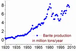 The baryte reserves are estimated between 0.7 and 2 billion tonnes. The maximum production, 8.3 million tonnes, was produced in 1981, but only 7–8% was used for barium metal or compounds.[5]: 5 Baryte production has risen since the second half of the 1990s from 5.6 million tonnes in 1996 to 7.6 in 2005 and 7.8 in 2011. China accounts for more than 50% of this output, followed by India (14% in 2011), Morocco (8.3%), US (8.2%), Turkey (2.5%), Iran and Kazakhstan (2.6% each).[20]