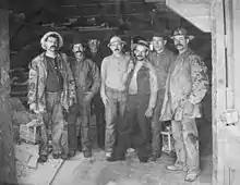 These claims were followed by claims from Lemuel S. "Sandy" Bowers (see Bowers Mansion), Joseph Plato, Henry Comstock, James Rogers, and William Knight. In the spring of 1859, after digging down to a depth of about ten feet, they found a gold-rich reddish quartz vein. Their discovery was actually part of the Comstock Lode, the Old Red Ledge.[2]: 5–6 The four men are therefore credited with the rediscovery of the mine previously found by the Grosh brothers.[5]