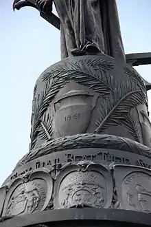 The topmost portion of the memorial consists of a larger-than-life figure of a woman representing the South.[46][141][130] The orientation of the figure and its face is toward the south, in part to honor the Confederacy[145][128][142] but also so that the sun may shine on the face of the figure at all times (which is symbolic of being favored).[132] The figure's head is crowned with an olive wreath,[46][142] which is both sacred to Minerva (Roman goddess of war and wisdom)[130] and a symbol of peace.[142] The figure's left hand extends a laurel wreath toward the south[46][141][145][130] in acknowledgment of the sacrifices made by the South's men in arms[46][142] and as a symbol of the past.[128] The figure holds a pruning hook in its right hand, which in turn rests on a plow.[46][141] This represents peace and reconciliation[46][141] as well as the hope that the labor of the South will lead to new glory.[130]
