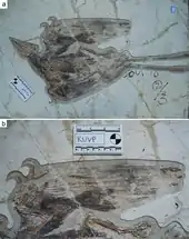 In 2002 Hou named the genus Jinzhouornis, but Chiappe et al. (2018) and Wang et al. (2018) showed that this genus is a junior synonym of Confuciusornis based on morphometry and examination of known confuciusornithiform specimens.[13][21]