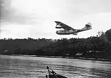 The Royal Australian Air Force ordered its first 18 PBY-5s in 1940, intending to use them for naval patrols.[8] However, following the declaration of war on the Japanese Empire by the British Empire and its Commonwealth, the Catalinas were pressed into a number of different roles. The initial Japanese offensives in Southeast Asia were immensely successful, with the Fall of Singapore in February 1942 leading to the abandonment of the Singapore strategy and the adoption of a policy of general withdraw being enacted by the Australian armed forces. This turn of events isolated tens of thousands of Allied soldiers and civilians from Allied controlled territories. In response, RAAF Catalinas (among other aircraft) formed a rapid evacuation service from Java for hundreds of evacuees who were ferried to the port of Broome, Western Australia. During the last weeks of February 1942 more than 7000 people were successfully transported to Broome.[2] Concerned with the evacuations and seeking to limit Allied bomber activity, the Japanese attacked Broome on 3 March 1942, destroying eight Catalinas along with 14 other aircraft. The attack led to a period referred to as the Western Australian emergency of March 1942, during which Catalinas were deployed to scout for a possible Japanese invasion force.[2][4]