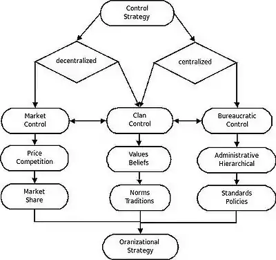 Decentralized control or market control is typically maintained through factors such as price, competition, or market share. Centralized control such as bureaucratic control is typically maintained through administrative or hierarchical techniques such as creating standards or policies. An example of mixed control is clan control which has characteristics of both centralized and decentralized control. Mixed control or clan control is typically maintained by keeping a set of values and beliefs or norms and traditions.