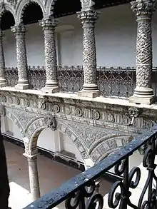The cloister is noted for its mix of Baroque and Mudéjar elements,[1] and has been called one of the most beautiful monasteries built in Mexico because of its elaborate decoration.[1][2][4] In the middle is a patio, surrounded by two floors of columns with arches, behind which are walkways. A large staircase leads to the upper floor and tower next to the street. On each of the four sides of the patio, the seven ground-floor columns divide into fourteen upper-floor columns. The ground-floor columns are of Doric style and the keystones of each of the arches bear medallions with images of apostles or Mercedarian friars.[1] The columns of the upper floor, built later, have more decoration than the lower.[4] These columns are decorated with lattices intertwined with foliage and fruit.[1][2] The spaces between the pilasters are decorated in Baroque style, with sculpted images of Mercedarian friars in the triangles that extend from the arches to the ceiling.[2] On the undersides of the arches, small pyramids point downwards.[1][2]