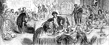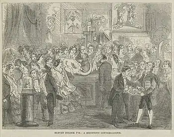 In England, however, it soon came to be far more widely used to denote the gatherings of a far more intellectual character, and was applied in the more specific sense of a scientific, artistic, or literary assembly/soirée,[14] generally held at night.[15][16][17]