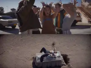 Other scenes in the video show Lo with a shaven head in a desert while writhing on the top of a glass coffin containing Esco's character; this scene represents Lo's freedom from her self-destructive side.[70] Publications such as Fuse, Jenesaispop and Much said this scene represents the death of the singer's past self.[71][74][75] After the song's bridge, the music pauses and Lo sets light to her motel room while saying, "Pain and pleasure go hand in hand, they say. But no one mentions that pain is really just a path to more pleasure. No more fear."[71][72] Later scenes in the music video include a car crash[66][71][73] and it ends with the text "to be continued".[76][77]