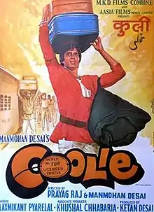 Coolie is a 1983 Indian action-comedy film, directed by Manmohan Desai and written by Kader Khan. The film stars Amitabh Bachchan as Iqbal Aslam Khan, a railway coolie, with supporting roles played by Rishi Kapoor, Rati Agnihotri, Shoma Anand, Kader Khan, Waheeda Rehman, Suresh Oberoi and Puneet Issar.