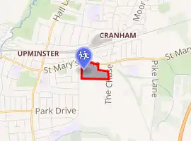 It is situated on St Mary's Lane (B187) about half a mile east of Upminster station, just over a mile west of the M25, and two miles from junction 29 (A127).