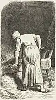 ![]() La grande bergère assise Woodcut, c. 1874 Various collections | ![]() The Shepherdess 1889 Tel Aviv Museum of Art, Israel (F699) | The source was a woodcut (27.3 x 21.9 cm) by Jean-Baptise Millet after his brother Jean-François Millet. Its strong contour line was the inspiration for Vincent van Gogh's Sorrow.[55] |