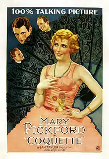 With the arrival of talkies Pickford immediately took to the new medium, being one of the first major stars to do so. At her Pickfair Studios she installed a sound stage in 1928, and began preparing for her first talkie. She bought the rights to Coquette, a play that Helen Hayes had made popular on the stage. Coquette is the story of a flirtatious southern girl who chooses to stand behind her father after he kills the man that she loves. Much like My Best Girl the role was adult, with Pickford portraying a flapper type for the first time. Sound technology was extremely touchy at the time, with footsteps or rattling jewelry ruining takes.[6] Cameras could barely move, and were hidden behind glass so as to not interfere with the sound recording. Pickford employed the best technology possible, resulting in a film that had more natural movement and acting than other early talkies.[6]