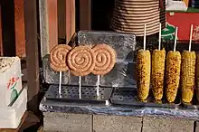 Yaki-Toumorokoshi (焼きとうもろこし, "roasted sweet corn"), or Yaki-Toukibi is Japanese snacks. Generally, corn is coated with soy sauce and grilled. In the middle of the Meiji Era (around 1890), the popularity of Yaki-Toumorokoshi stalls spread in Sapporo, Hokkaido. Even today, Yaki-Toumorokoshi stalls can be seen at Japanese festivals.
