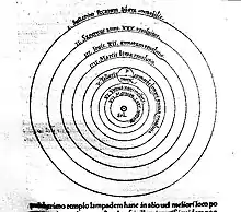 The idea of celestial spheres was developed in the cosmological models of Plato, Eudoxus, Aristotle, Ptolemy, Copernicus, and others.[16] They believed in a stable cosmos created by God, where distinct realms were subject to different kinds of order. Europeans maintained the Aristotelian view that infinity could only be seen as an attribute of God, with the cosmos being finite. Furthermore, following the Aristotelian view that "nature abhors a vacuum", Europeans believed that the space between the spheres were filled with air.[15] This theory persisted until the Scientific Revolution, when the discovery that the Sun was in the center of the planetary system rocked cosmological understanding to its core.