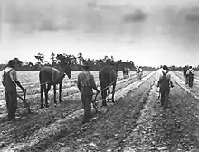 A record 1931 cotton crop of over 15.5 million bales, over two million higher than projected, resulted in a plunge in prices of agricultural commodities.[1] At its lowest since 1905, the price of cotton was less than the cost of production.[2][3] In a telegram to the governors of fourteen cotton-producing states, the Federal Farm Board (FFB) chairman recommended that farmers be forced to plow over every third row of cotton, destroying some 4 million bales of the 1931 crop.[4] The advice was widely criticized.[5]