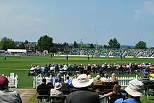 Further redevelopment of the ground took place in 2014, partly to provide the opportunity to increase revenue from non-cricket activities as the site was making a loss for the cricket club.[3][30][31] Kent had played no matches on it in 2013[2] and would have pulled out of the ground if the development had not gone ahead.[32] They returned in 2015 with six days of cricket scheduled, including a County Championship match and two NatWest t20 Blast fixtures.[33][34][35] The £30 million redevelopment has seen the club open a new indoor cricket centre and a function centre and the ground now features a permanent 2,048-seat spectator stand and all-weather sports facilities.[36][33][37][38][39][40][41] The ground adjoins the training facilities used by Crystal Palace Football Club[3] who make some use of the all-weather facilities on the site. A new digital scoreboard has been installed at the ground and the outfield has been improved.[42]