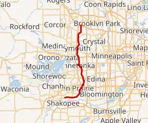Hennepin County Road 61 goes by many names. From its northern junction with CR 130 in Maple Grove, County Road 61 (CR 61) is also known as Hemlock Lane, with an interchange at I-94. Just north of its junction with CR 10 (Bass Lake Road) and the boundary with Plymouth it becomes Northwest Boulevard and continues under that name until its junction with State Highway 55 (MN 55), intersecting with CR 47 (Pineview Lane North) and CR 9 (Rockford Road). Between MN 55 and the boundary with Minnetonka it is known as Xenium Lane, intersecting with CR 6. Between the Minnetonka boundary and CR 5 (Minnetonka Boulevard), it is known as Plymouth Road, intersecting with I-394 and Cedar Lake Road. South of Minnetonka Boulevard, it changes names again to Shady Oak Road and continues into Eden Prairie, intersecting with MN 7, MN 62 and ends at US Highway 212 (US 212), but Shady Oak Road itself continues for a short distance into the "Golden Triangle" area of Eden Prairie and ends at Valley View Road. Once US 212 was shifted onto its new freeway alignment in 2008 through Eden Prairie and Chaska, the old alignment (Flying Cloud Drive) took on the designation of CR 61 continuing to the county line with Carver County.[2]