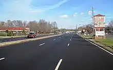 A short distance later, CR 522 enters Manalapan Township in Monmouth County and passes through wooded areas with some homes before entering Englishtown. In Englishtown, the route passes homes and turns east onto Water Street, reaching an intersection with CR 527. CR 522 turns south onto CR 527, and the two routes head south on Main Street past residences and businesses. CR 522 splits from CR 527 by turning east onto Tennent Avenue. The road crosses back into Manalapan Township and becomes Englishtown-Freehold Road, heading southeast past residential neighborhoods and a tract of Monmouth Battlefield State Park. After crossing CR 3 (Tennent Road), the route passes through fields and woods within Monmouth Battlefield State Park. Within the park, CR 522 crosses into Freehold Township and turns east, running immediately to the north of Conrail Shared Assets Operations' Freehold Industrial Track. The road comes to an interchange with US 9, at which point CR 522 is briefly a four-lane divided highway. Past this interchange, the route heads into residential and commercial areas as a two-lane road. Upon entering Freehold Borough, CR 522 becomes municipally maintained Thockmorton Street, which turns southeast into residential areas. At the Monmouth Avenue intersection, the road heads into the commercial downtown of Freehold, where CR 522 ends at CR 537.[1][3]