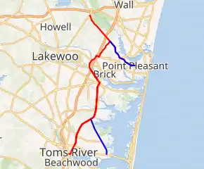 CR 549 begins at an intersection with Route 166 and the southern terminus of CR 527 in Toms River, Ocean County, heading east on four-lane undivided Water Street. The road runs through the commercial downtown of Toms River a short distance to the north of the Toms River. The route turns north onto Hooper Avenue, which passes through more of the downtown area before heading into residential areas and narrowing to two lanes. Upon crossing Route 37, CR 549 becomes a six-lane divided highway with jughandles that passes through commercial areas, narrowing to four lanes. The road heads to the west of the Seacourt Pavilion shopping center and intersects CR 571 at an at-grade cloverleaf interchange. Following this, the roadway passes to the west of the Ocean County Mall, widening to six lanes again. The road narrows back to four lanes at the CR 94 intersection as it passes more shopping centers, turning more to the northeast. CR 549 enters wooded areas as it passes an entrance to Ocean County College and comes to an intersection with the northern terminus of the southern CR 549 Spur. Past this intersection, the route makes a turn to the north again and enters more commercial areas, crossing CR 620 before entering Brick Township. Here, CR 549 becomes Brick Boulevard and intersects CR 631 before continuing past more development with three northbound lanes and two southbound lanes. After the CR 66 junction, the road carries two lanes in each direction as it reaches intersections with CR 624 and CR 528, turning more to the northeast. CR 549 comes to an intersection with CR 631, at which point CR 549 splits from Brick Boulevard by heading northwest on Chambers Bridge Road, with CR 631 continuing north on Brick Boulevard. The four-lane undivided road passes shopping centers and crosses Route 70. After this intersection, CR 549 widens into a four-lane divided highway again and passes more businesses, turning into an undivided road again as it comes to a partial interchange with the Garden State Parkway that has access to and from the southbound direction of the parkway.[1][2]